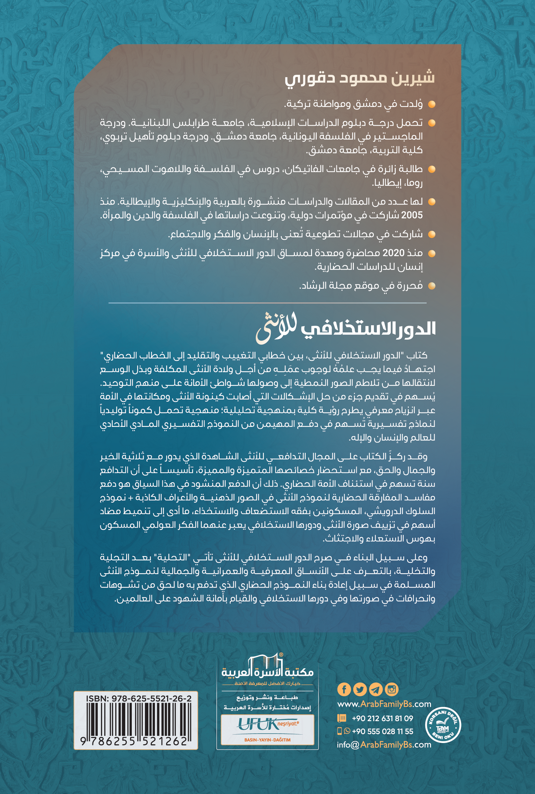 كتاب “الدور الاستخلافي للأنثى، بين خطابي التغييب والتقليد إلى الخطاب الحضاري” اجتهادٌ فيما يجب علمُهُ لوجوب عمَلِهِ من أجل ولادة الأنثى المكلفة وبذل الوسع لانتقالها من تلاطم الصور النمطية إلى وصولها شواطئ الأمانة على منهج التوحيد. يُسهم في تقديم جزء من حل الإشكالات التي أصابت كينونة الأنثى ومكانتها في الأمة عبر انزياح معرفي يطرح رؤية كلية بمنهجية تحليلية؛ منهجية تحمل كموناً توليدياً لنماذج تفسيرية تُسهم في دفع المهيمن من النموذج التفسيري المادي الأحادي للعالم والإنسان والإله. فكان مدخل الكتاب من زاوية الاستئناف الحضاري يعرض لمفاهيم منظومة إقامة الدين الكبرى (شرعياً، قيمياً /أخلاقياً /جمالياً، اجتماعياً)، ويعتني بمفاهيم ومحددات أهلية الاستخلاف وعمارة الأرض والأمانة والمسؤولية والتكليف ويؤكد على التدبر في الآفاق والأنفس الدالة على استعمال العقل والتعلم والتفكر والتأمل وإعمال السنن… أي بالبيان والتنظير والعلم.